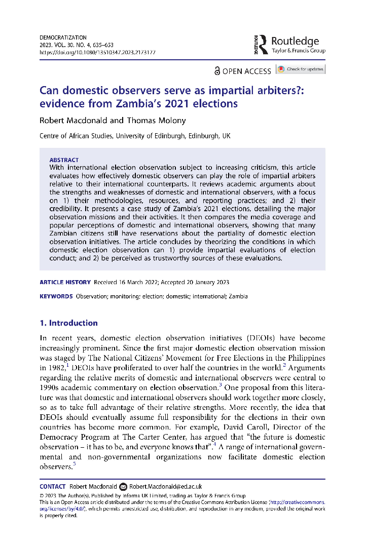 Democratization (peer reviewed article) - 'Can domestic observers serve as impartial arbiters?: evidence from Zambia’s 2021 elections' by Robert Macdonald and Thomas Molony